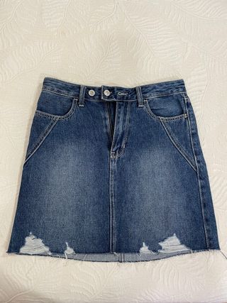 Falda vaquera de tiro alto con detalles desgastados en el bajo. - Diseño con bolsillos. - Cierre de cremallera y botón. - Costuras en contraste.