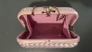 Elegante bolso de mano en tono rosa nude, perfecto para ocasiones especiales. Su diseño tejido le da un toque sofisticado. Medidas 17(L), 12(alto), 6 (fondo) - Acabado satinado. - Cierre de broche. - Cadena dorada para llevar al hombro.
