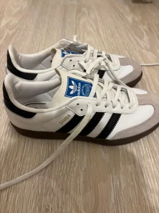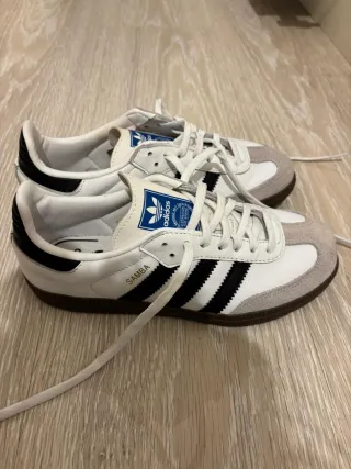Zapatillas Adidas Samba clásicas en blanco y negro. Un diseño icónico para el día a día. - Parte superior de cuero y gamuza. - Detalle de las tres rayas en negro. - Suela de goma. - Logo de Adidas en la lengüeta. Prácticamente nuevas . Talla 35