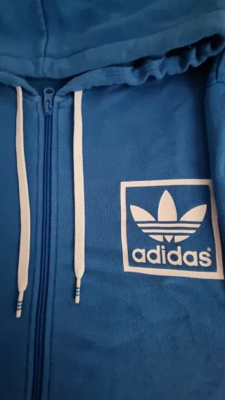 Sudadera Adidas Originals azul con capucha y cremallera. Talla XL. - En muy buen estado, poco uso. - Interior suave y muy cómoda. - Bolsillos delanteros tipo canguro. - Logo Adidas en el pecho y detalle de las tres bandas en la manga. - Ideal para uso diario o deporte. Más ropa en mi perfil.