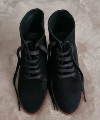 Botines Fosco negros de ante con tacón ancho. Talla 38. - En muy buen estado, apenas usados. - Tacón cómodo y estable. - Ideales para vestir o para el día a día. - Suela prácticamente nueva. - Cierre con cordones. - Diseño elegante. Más ropa en mi perfil.