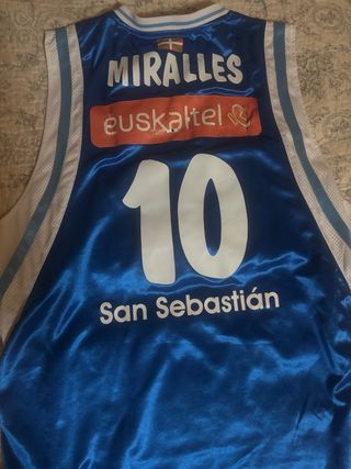 Camiseta oficial de baloncesto de Albert Miralles, dorsal número 10. - Firmada por el jugador. - Diseño con el nombre 'Miralles' y el número 10 en blanco. - Incluye el logo de Euskaltel. - Detalle de la bandera vasca. - Nombre de la ciudad 'San Sebastián' en la parte inferior.