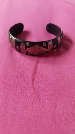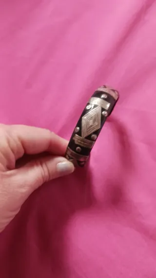Pulsera tuareg hecha a mano, comprada en Marruecos. Hecha de ébano y plata auténtica. Anchura 1.8 cm. Tiene dos defectos, ya que la lámina de plata, se enganchó. Ver fotos. Precio bajo por dichos defectos. En mi perfil tengo otra igual, pero más grande y sin defectos.