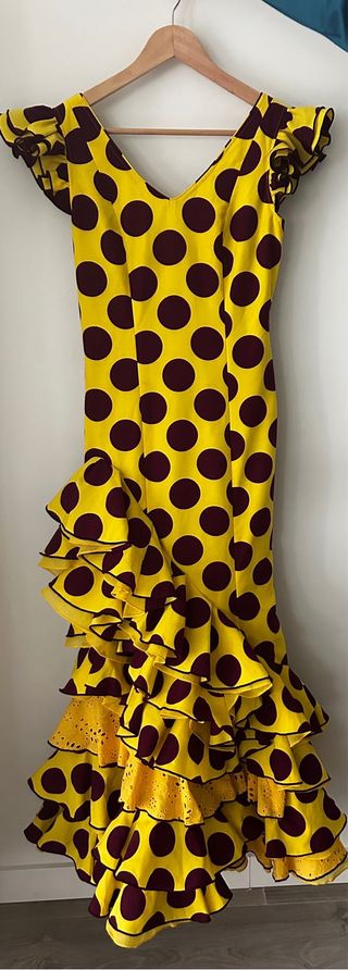 Vestido de flamenca con un llamativo estampado de lunares grandes. - Diseño con volantes en cascada. - Mangas con volantes. - Detalle de puntilla en el bajo. Muy buen estado y muy cómodo. Tiene una manchita muy pequeña cerca de axila.