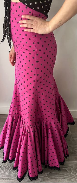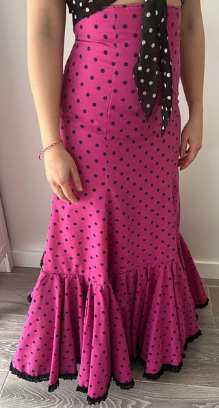 Falda flamenca de corte sirena con volantes en el bajo y detalle de encaje negro. El estampado es de lunares verdes sobre fondo rosa fucsia. - Diseño de talle alto. - Volantes en cascada. - Adorno de encaje en el bajo. Preciosa tiene 3 capas en el bajo lo que hace que tenga volumen. Se puede sacar hasta una 38-40 y de largo también 5-7 cm al menos.
