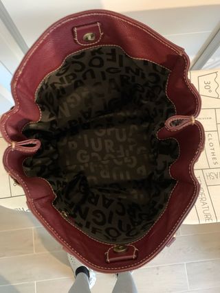 Elegante bolso tote de piel en color rojo, con un diseño distintivo. - Detalle de logo grabado en relieve. - Cremalleras laterales decorativas. - Asa de mano. - Incluye un charm colgante a juego.