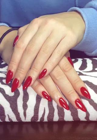 Uñas postizas de gel o acrílicas con un acabado brillante y elegante. - Forma de almendra. - Color rojo intenso.
