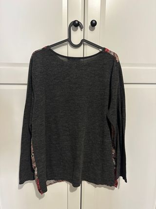 Blusa de manga larga con un diseño estampado llamativo. - Mangas de color gris oscuro. - Parte frontal con estampado floral y paisley. - Cuello redondo.