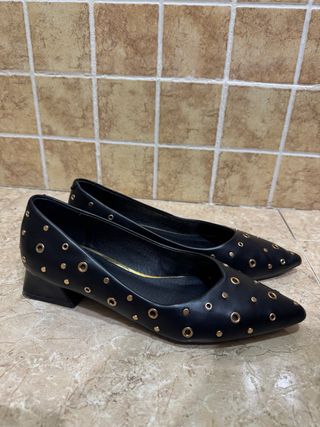 Elegantes zapatos de salón con tacón bajo. - Diseño de punta afilada. - Adornados con tachuelas doradas. - Tacón bajo y cómodo.