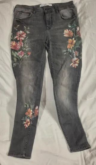 Vaqueros de corte ajustado con un diseño floral. - Estampado de flores en tonos rosas, naranjas y verdes. - Lavado desgastado. - Tiro medio. Perfecto estado. Muy poco uso. Visita mi perfil.