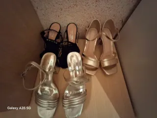 Elegantes tacones en dos combinaciones de color. - Tacones negros con detalle de tiras y Tachuelas. - Tacones dorados con tiras finas y pulsera al tobillo. - Tacones Plateados con tiras cruzadas en la pala. (Los 3 a 15, separados a 5€) Los 3 son talle 36