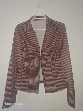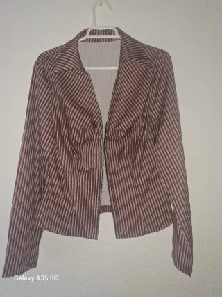 Elegante blazer con un diseño de rayas verticales. - Patrón de rayas en tonos marrones y blancos. - Corte entallado. - Cuello solapa.