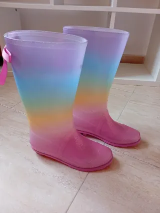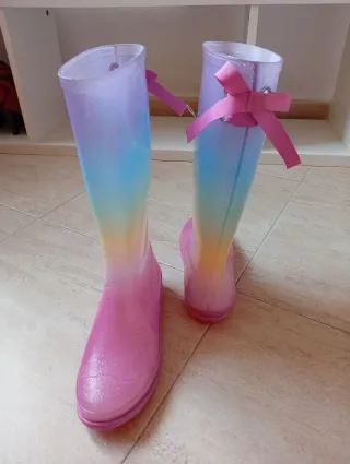 Botas de agua transparentes con un degradado de colores arcoíris y detalles brillantes. Perfectas para días de lluvia. - Diseño de arcoíris con degradado de colores. - Lazo decorativo rosa en la parte superior. - Acabado brillante con purpurina.