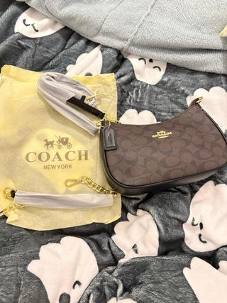 Elegante bolso de la marca Coach con un diseño clásico. - Patrón de monograma distintivo. - Detalles metálicos dorados. - Incluye etiqueta colgante.