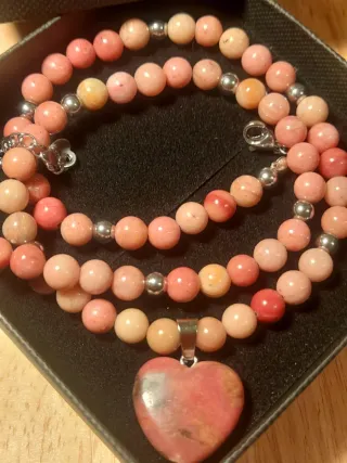 Collar hecho a mano con cuentas de piedra natural y un colgante en forma de corazón. - Cuentas de piedra natural rodonita - Colgante de piedra natural con forma de corazón,de rodonita - Cierre y cadena de acero inoxidable _El collar mide 44cm más 5cm de extensión