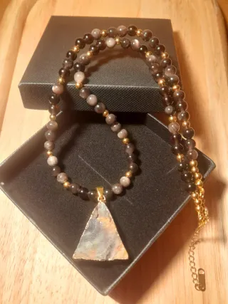 Elegante collar hecho a mano con piedras naturales de obdidiana y detalles dorados. El colgante es una piedra con forma triangular y bordes irregulares. - Piedras naturales en tonos oscuros y grises. - Cuentas doradas intercaladas. - Colgante triangular con acabado natural.