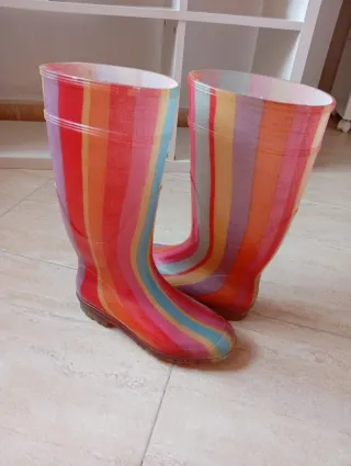 Botas de agua con un diseño alegre y llamativo. - Diseño de rayas verticales. - Acabado brillante.