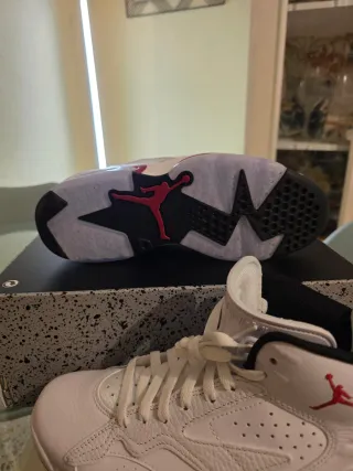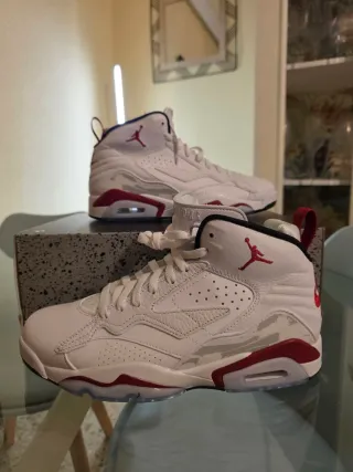 Zapatillas Jordan MVP en blanco con detalles en rojo. Un diseño icónico para tu colección. - Parte superior de cuero blanco. - Detalles en color rojo. - Suela de goma.