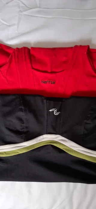 Camisetas de pádel de la marca Naffta, talla S. Ideales para jugar al pádel. - En perfecto estado. - Diseño deportivo y elegante. - Cómodas y de gran calidad Cada una por 8 euros. El puck por 24 Es una ganga ya que esta marca de padel es carisima, pero es cierto que la calidad es muy buena. Olvidate de que el producto se dañe, le salgan bolas, se descosa,etc. Material parecido al neopreno, por lo que es comodo para jugar, no se mueve y ademas recoge, no tienes sensacion de que se suba o se te mueva el pecho.