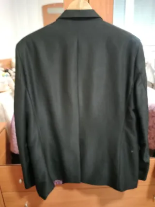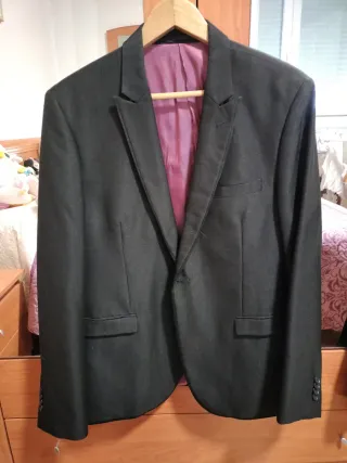 Elegante traje de chaqueta negro, ideal para eventos especiales. - Forro interior de color morado. - Cierre de un botón. - Bolsillos frontales con solapa. - Puño con tres botones.