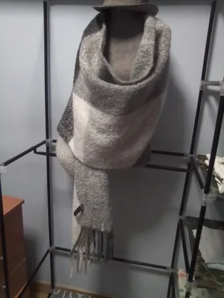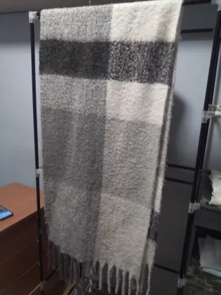 Bufanda gruesa con diseño a cuadros en tonos grises, blanco y negro. Es muy suave y cálido. Medidas: Largo 248 cm y ancho 54 cm. - Diseño a cuadros. - Acabado con flecos.