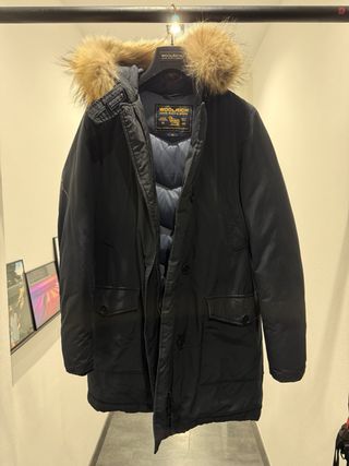 Parka negra de la marca Woolrich con capucha. - Capucha con detalle de pelo. - Diseño largo y abrigado.