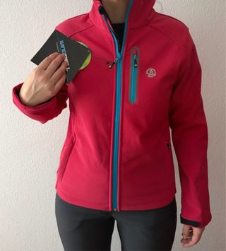 Chaqueta Ternua con cremallera frontal y bolsillos. - Color fucsia. - Detalles en azul turquesa. - Cuello alto. - Talla S/36