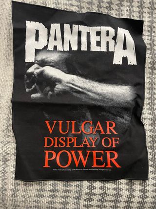 Espaldera con el diseño icónico de Pantera. - Diseño frontal Vulgar Display of Power. - Estampado blanco y rojo sobre fondo negro. - Dimensiones : 29cms anncho (arriba) - 26 cms ancho (abajo) - 36 cms alto