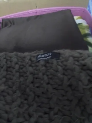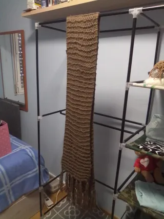Bufanda tejida de color marrón, con un diseño de punto grueso y flecos en el extremo. - Material: Hilo grueso. - Diseño: Punto ondulado. - Acabado: Flecos en el bajo. - Medidas: 250 x 25 cm.