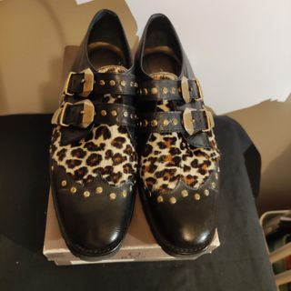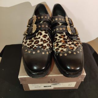 Mocasines de la marca El Cuco con un diseño llamativo. Le falta una tachuela en el pie derecho. - Combinación de piel negra y estampado animal. - Doble tira con hebillas doradas. - Detalle de tachuelas alrededor de la puntera.