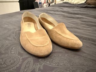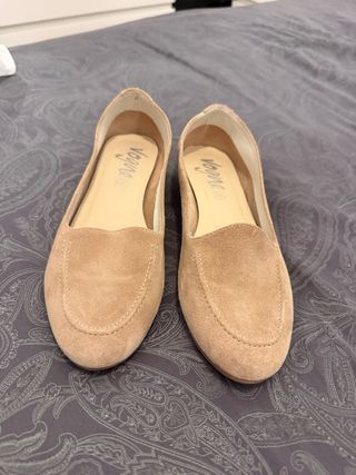 Mocasines planos de ante en color beige. Solo una puesta, como se puede ver en las fotos, por error de talla. - Diseño de pala. - Detalle de pespuntes. - Acabado festoneado en el cuello.