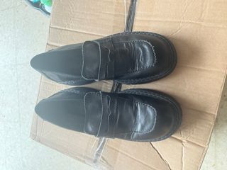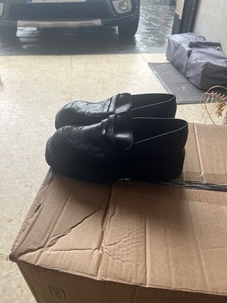 Elegantes mocasines negros de tacón bajo, perfectos para cualquier ocasión. - Diseño tipo mocasín. - Detalle de hebilla dorada. - Acabado brillante en la puntera y el tacón. son muy cómodos e y están súper bien cuidados
