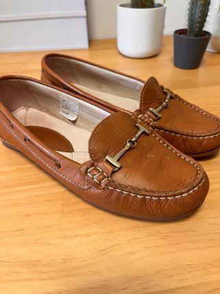 Zapatos tipo mocasín de la marca Callaghan en tono beige y marrón. Como nuevas. - Diseño clásico con pespuntes. - Interior forrado con detalles de rayas de colores.