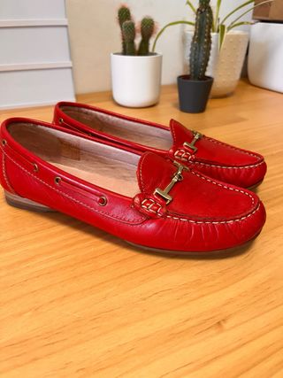 Mocasines de piel con detalle metálico. - Material: Piel - Color: Rojo - Adorno: Detalle metálico dorado en la pala