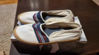 Zapatillas de lona blanca con diseño náutico. - Detalle de rayas en azul y rojo. - Ribete de esparto en la suela. - Interior con logo de la marca.