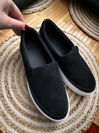 Zapatillas UGG para niños en color negro. - Exterior de ante. - Suela blanca. - Diseño slip-on.