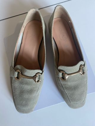 Elegantes zapatos planos para mujer, perfectos para cualquier ocasión. - Diseño tipo mocasín. - Detalle metálico dorado en la pala. Las hebillas doradas tienen unas pequeñas manchas . - Material exterior de tipo ante o serraje. - Suela interior con logo del comercio . - Los zapatos se han usado pocas veces