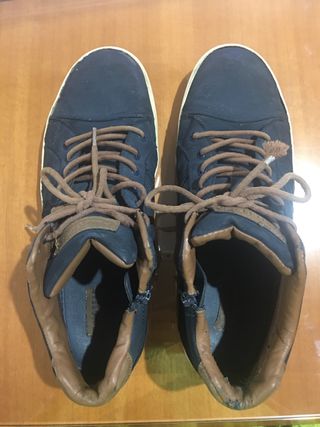 Zapatillas altas azul marino con cordones marrones y detalles en polipiel. Son de antelina Las he usado mucho Zapatillas náuticas de estilo clásico. - Cierre con cordones. - Interior forrado a rayas. Las he usado mucho, tienen algunos pequeños roces. - Detalle de cremallera lateral. - Forro interior de piel. y plantilla