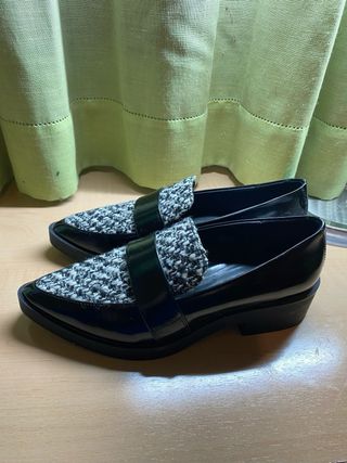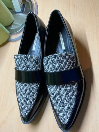 Mocasines de Zara Basic con un diseño elegante. - Combinación de piel negra y tejido tweed. - Detalle de tira brillante en la pala. - Punta fina.