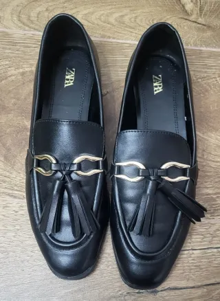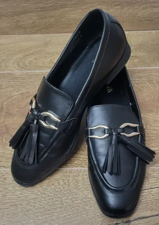 Elegantes mocasines de Zara en color negro. Un diseño clásico con un toque moderno. - Detalle de tassel en la parte delantera. - Adorno de hebilla dorada. - Diseño tipo mocasín.