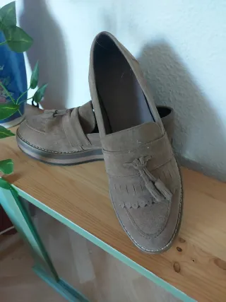 Preciosos mocasines de ante marrón, ideales para cualquier ocasión. Diseño clásico con detalle de flecos. - Suela gruesa y cómoda. - Perfectos para un look casual o elegante.