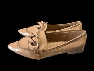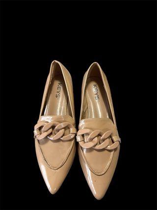 Mocasines de charol con detalle de eslabones. - Diseño de punta fina. - Acabado brillante. - Marca KEYS.