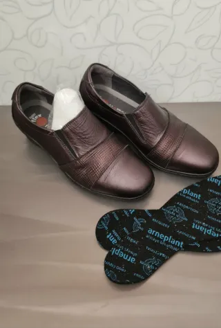 Zapatos planos de color bordeo con un diseño elegante y moderno. Perfectos para el día a día. - Material exterior de cuero. - Suela con absorción de impacto. - Plantillas transpirables y antibacterianas.