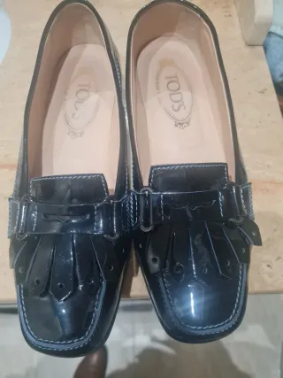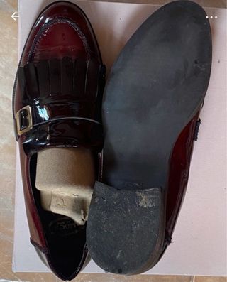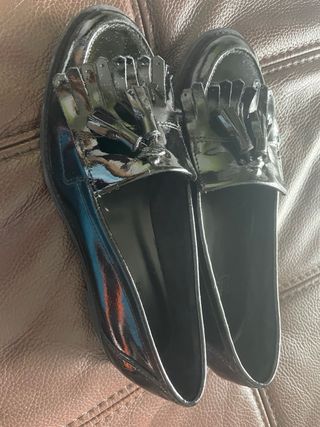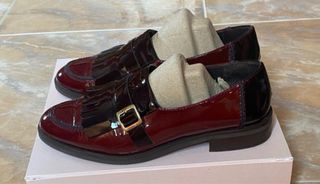 Elegantes mocasines de piel con un diseño clásico y moderno. Perfectos para añadir un toque sofisticado a cualquier atuendo.El número 38 aquí es un poquito justo. - Acabado brillante en tonos burdeos y negro. - Detalle de flecos en la pala. - Suela de goma resistente.