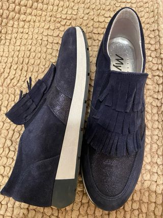 Zapatos náuticos/mocasines de ante azul klein – Plataforma gruesa, talla 39 Se venden zapatos informales estilo náutico o mocasín para mujer, con plataforma gruesa y cordones. ✅ Características: • Estilo: Náutico/mocasín con cuña. • Material: Ante de alta calidad. • Color: Azul klein, llamativo y versátil. • Talla: 39 europeo (medida interior: 25,5 cm). • Ajuste: Ideales para pie ancho. • Estado: Puestos solo una vez, prácticamente nuevos. 📍 Entrega en mano en Lugo o 📦 envío disponible. Si buscas zapatos de plataforma cómodos, mocasines de ante azul, o náuticos de mujer en talla 39, ¡contáctame!