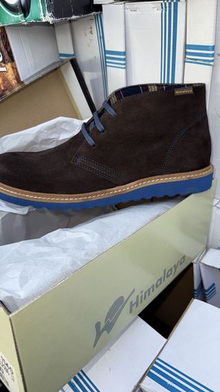 Lotes de Zapato, de caballero, 310 pares por liquidación de tiendas, todo en piel, zapatos y botas 10€ el par para todo el lote - Exterior de ante marrón. - Cordones y detalles en azul. - Suela de goma azul. - Forro interior a cuadros.