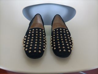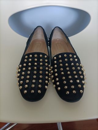 Preciosos mocasines de Uterqüe, ideales para darle un toque rockero a cualquier look. Son de color negro con tachuelas doradas. - Son de ante. - Están en muy buen estado.
