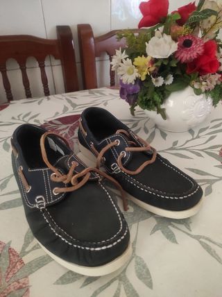 Sé usaron para una graduación y ahí quedaron Zapatillas náuticas de color azul marino, talla 41. Son de estilo casual y cómodas. - Material de ante. - Cordones de color marrón claro. - Suela blanca.
