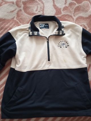 Parte de arriba tipo sudadera de la marca STRATOS. - Diseño bicolor en blanco y azul marino. - Cuello alto con media cremallera. - Detalle de logo bordado en el pecho. - Bolsillo tipo canguro en la parte delantera.