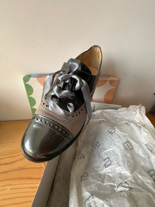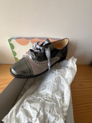 Mocasines de la marca Andanines. - Diseño bicolor en gris y negro. - Detalle de cordones grises de lazo y otros de repuesto de cordón. - Puntera con perforaciones decorativas.